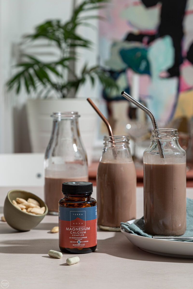 6) Για το σοκολατένιο ρόφημα, βάζουμε στο μπλέντερ ή στο μούλτι το γάλα αμυγδάλου, το κακάο, το ταχίνι, τους κολοκυθόσπορους, την κανέλα, το σιρόπι αγαύης και το περιεχόμενο από 2 κάψουλες Terranova Magnesium Calcium. Χτυπάμε καλά και καταναλώνουμε αμέσως.