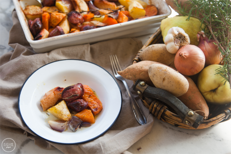 4. Λουκάνικα με γλυκοπατάτες, κυδώνια και πατάτες
