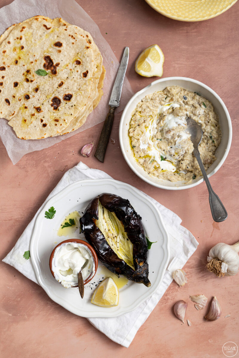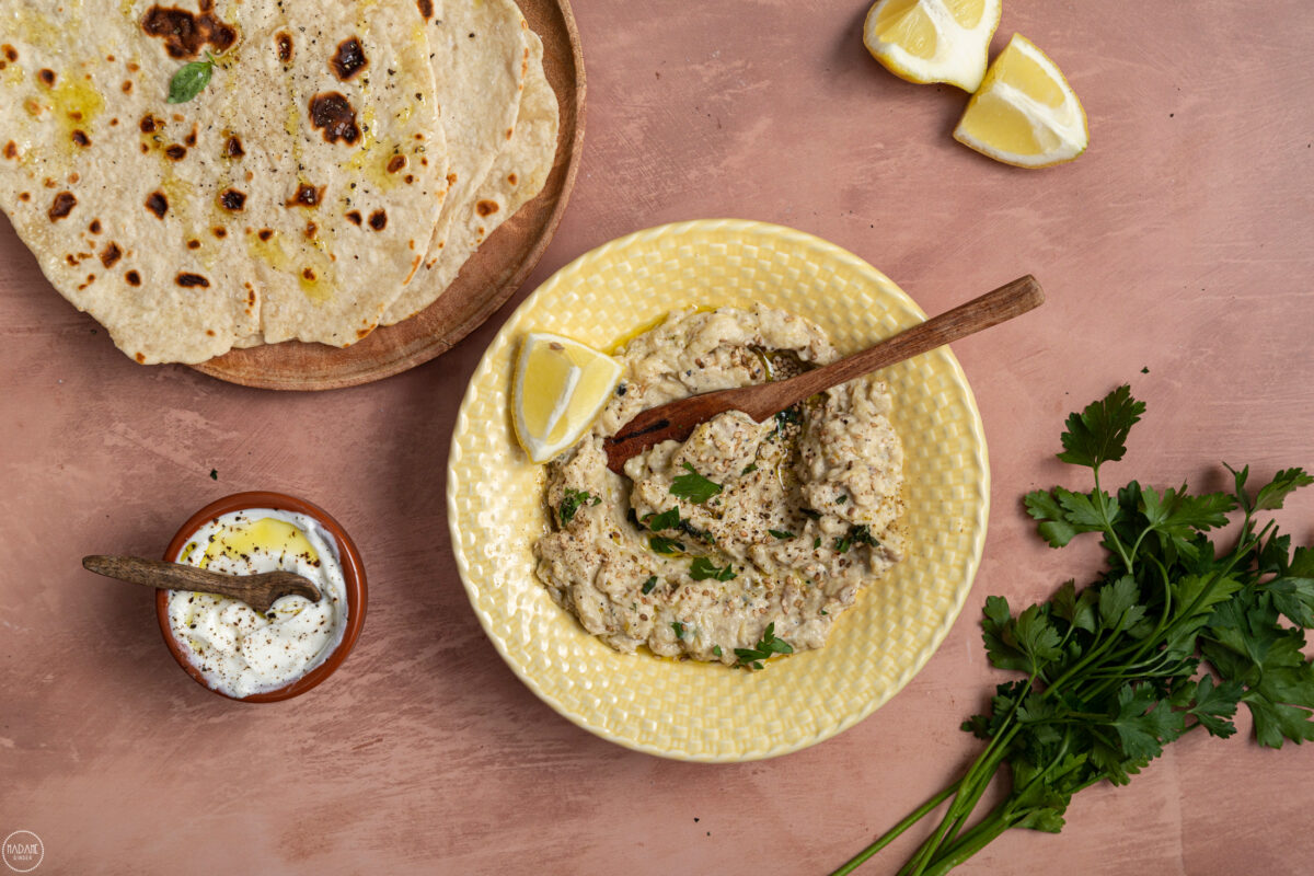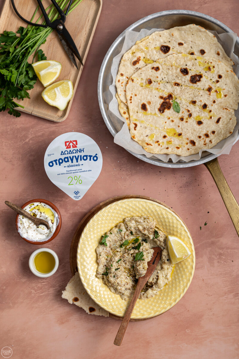 Baba ganoush (βελούδινη μελιτζανοσαλάτα) με γιαούρτι & flatbread με 2 υλικά