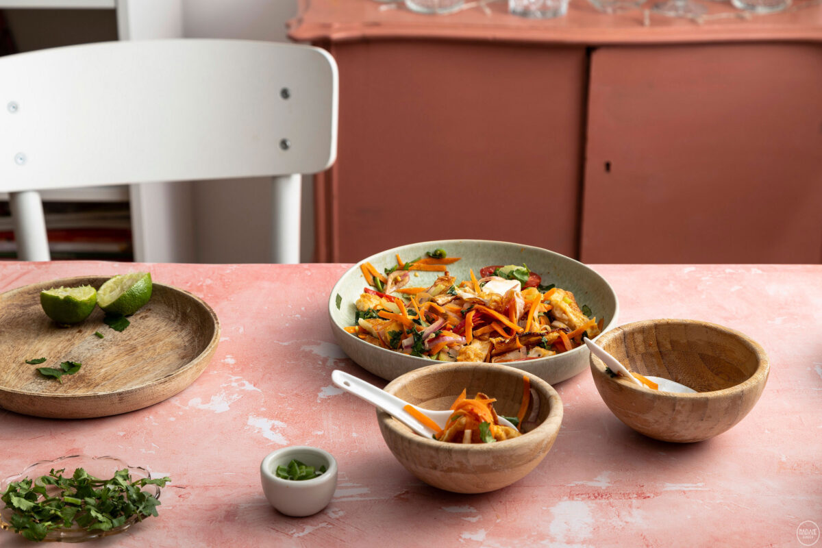 Με τον Μπάμπη από το TUK TUK – το πιο αγαπημένο μου Ταϊλανδέζικο στην Αθήνα-, γνωριστήκαμε σε ένα επεισόδιο #EatLikeALocal και καταλάβαμε αμέσως ότι μιλάμε την ίδια γλώσσα. Αγαπηθήκαμε, λατρευτήκαμε, εγώ απολαμβάνω πολύ συχνά τα πιάτα του και σ’ένα αυθόρμητο τηλεφώνημα έπεσε η ιδέα να έρθει στην κουζίνα μας και να μαγειρέψει κάτι για τα gingerάκια. Έτσι μια ηλιόλουστη μέρα, έσκασε ο Μπάμπης στο MG Food Studio, άνοιξε τα τέλεια οργανωμένα μπολάκια με τα υλικά του και μέσα σε 10 λεπτά μας έφτιαξε μία σαλάτα όνειρο!