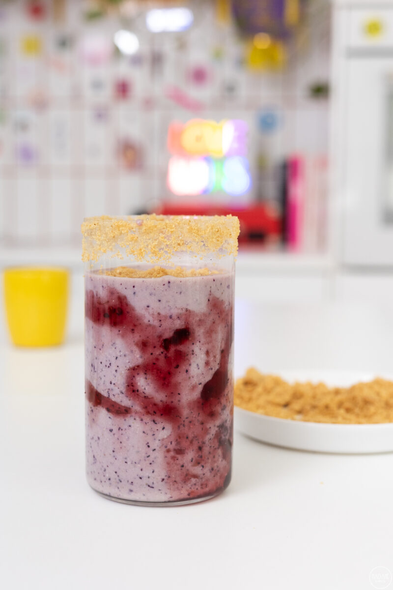 3)Βάζουμε την μαρμελάδα σε ένα μπολ και ανακατεύουμε με ένα κουτάλι για να μαλακώσει. Αν χρειάζεται, ρίχνουμε 1 κ.σ. νερό. Με το κουτάλι σχηματίζουμε σχέδια στο ποτήρι εσωτερικά με την μαρμελάδα (σαν σιρόπι). Ρίχνουμε στο ποτήρι το περιεχόμενο του μπλέντερ και σερβίρουμε.