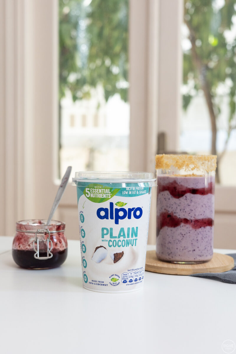1)Ρίχνουμε σε μπλέντερ το Alpro Φυτικό Επιδόρπιο Σόγιας με Καρύδα, μαζί με τα υπόλοιπα υλικά και πολτοποιούμε πολύ καλά