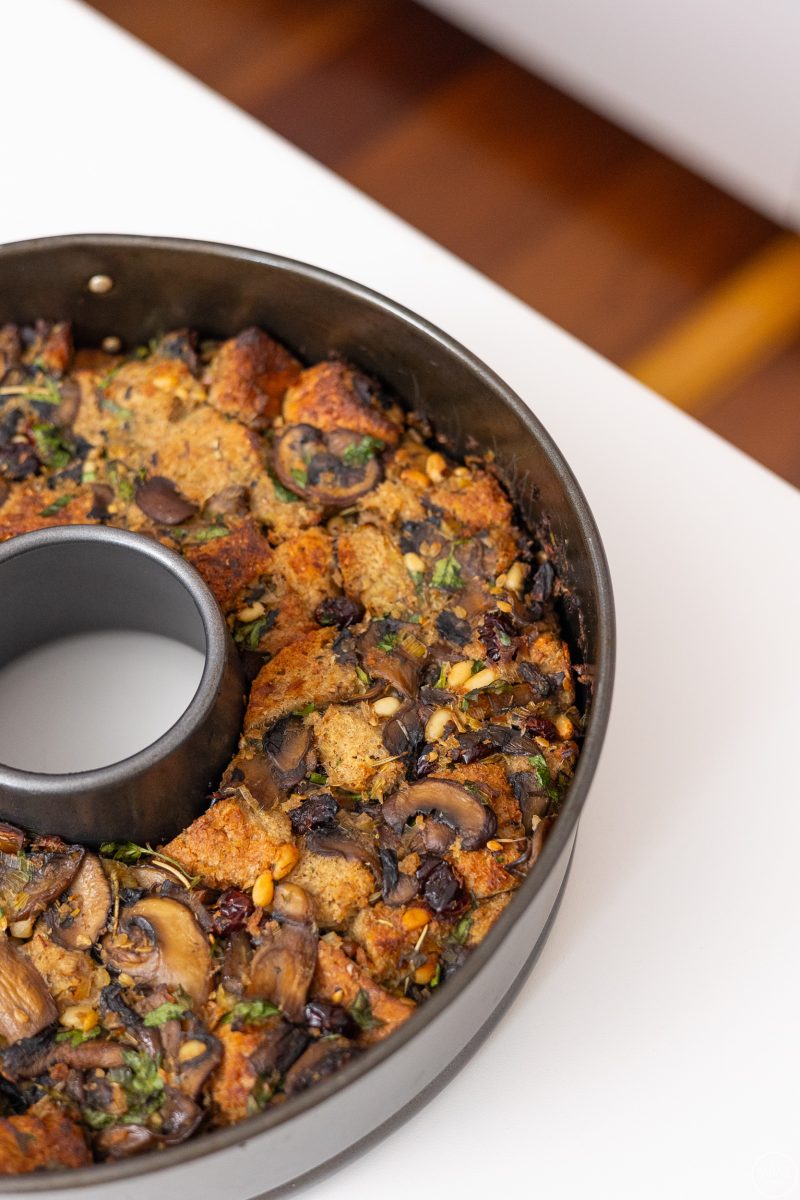 4)Σε μεγάλο μπολ ρίχνουμε τα μανιτάρια, το ψωμί και σταδιακά προσθέτουμε το νερό μέχρι να ενυδατωθεί το ψωμί αλλά να μη λασπώσει. Προσθέτουμε τον μαϊντανό, το κουκουνάρι και τα cranberries και φρεσκοτριμμένο πιπέρι κι ανακατεύουμε.