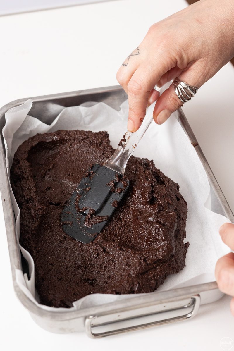 5)Ρίχνουμε το μείγμα σε ένα ταψί περασμένο με λαδόκολλα, απλώνουμε ομοιόμορφα και ψήνουμε σε προθερμασμένο φούρνο στους 175°C στον αέρα για 18-20 λεπτά.