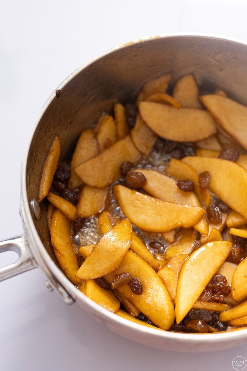 3)Παράλληλα ετοιμάζουμε τη γέμιση. Σε μικρό κατσαρολάκι λιώνουμε το βούτυρο μαζί με τη Βιολογική ζάχαρη καρύδας Nature’s Promise. Προσθέτουμε τα μήλα και τις σταφίδες, κι αφήνουμε να καραμελώσουν για 7-10 λεπτά. Μόλις είναι έτοιμα, κλείνουμε το μάτι και προσθέτουμε το εκχύλισμα βανίλιας. Αφήνουμε στην άκρη να κρυώσει.