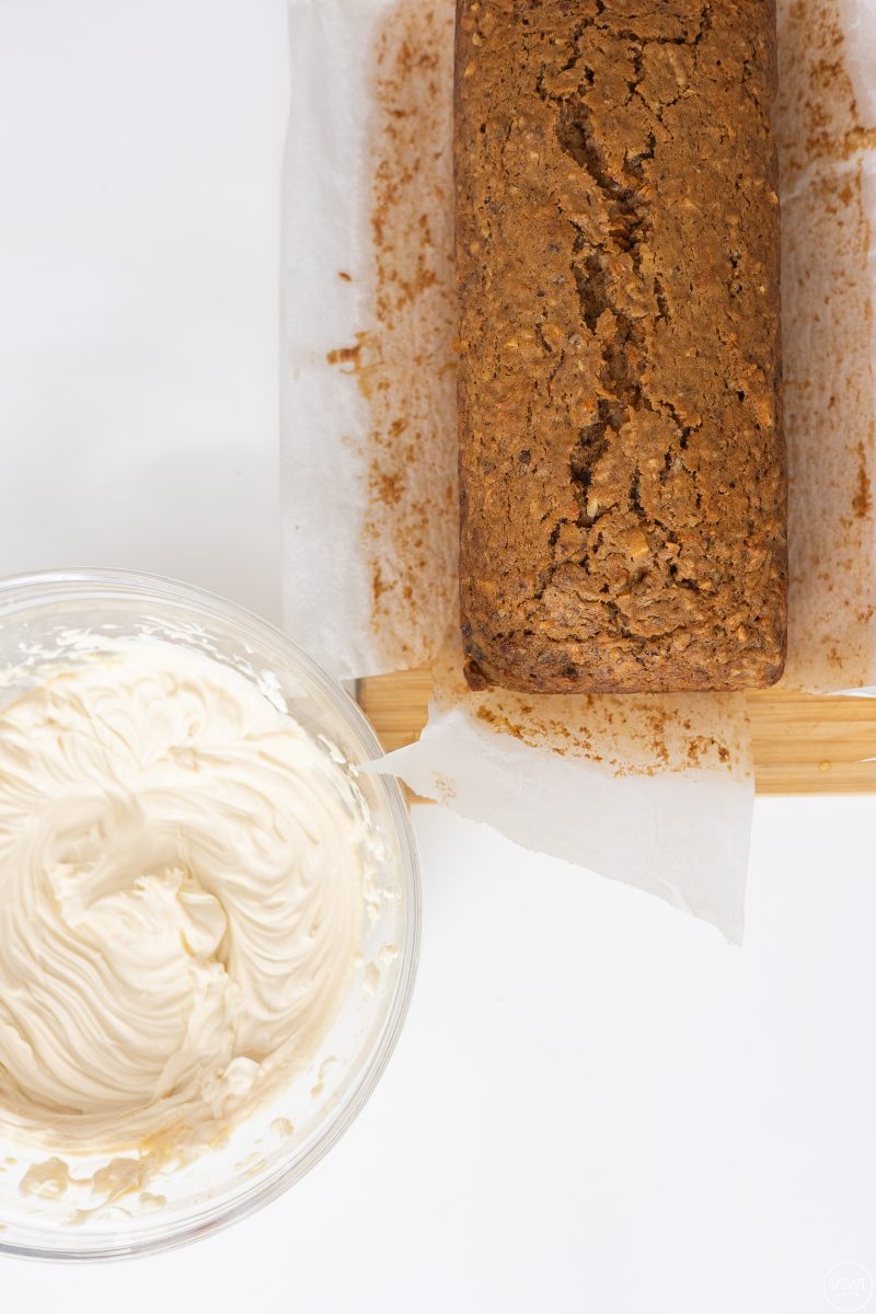 6)Μεταφέρουμε το μείγμα σε μακρόστενη φόρμα κέικ μήκους 25 εκ. περασμένη με λαδόκολλα. Ψήνουμε σε πολύ καλά προθερμασμένο φούρνο στους 170°C στις αντιστάσεις για 40 λεπτά ή μέχρι να βυθίζουμε μια οδοντογλυφίδα στο κέντρο και να βγαίνει καθαρή. Αφήνουμε στην άκρη να κρυώσει για 30 λεπτά.