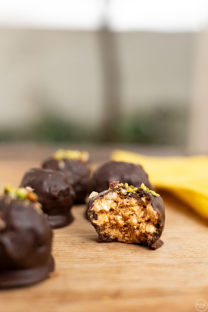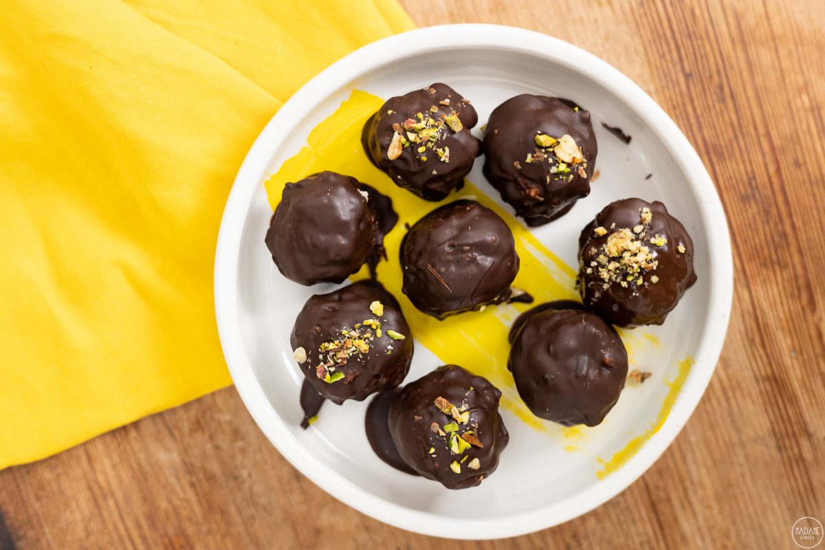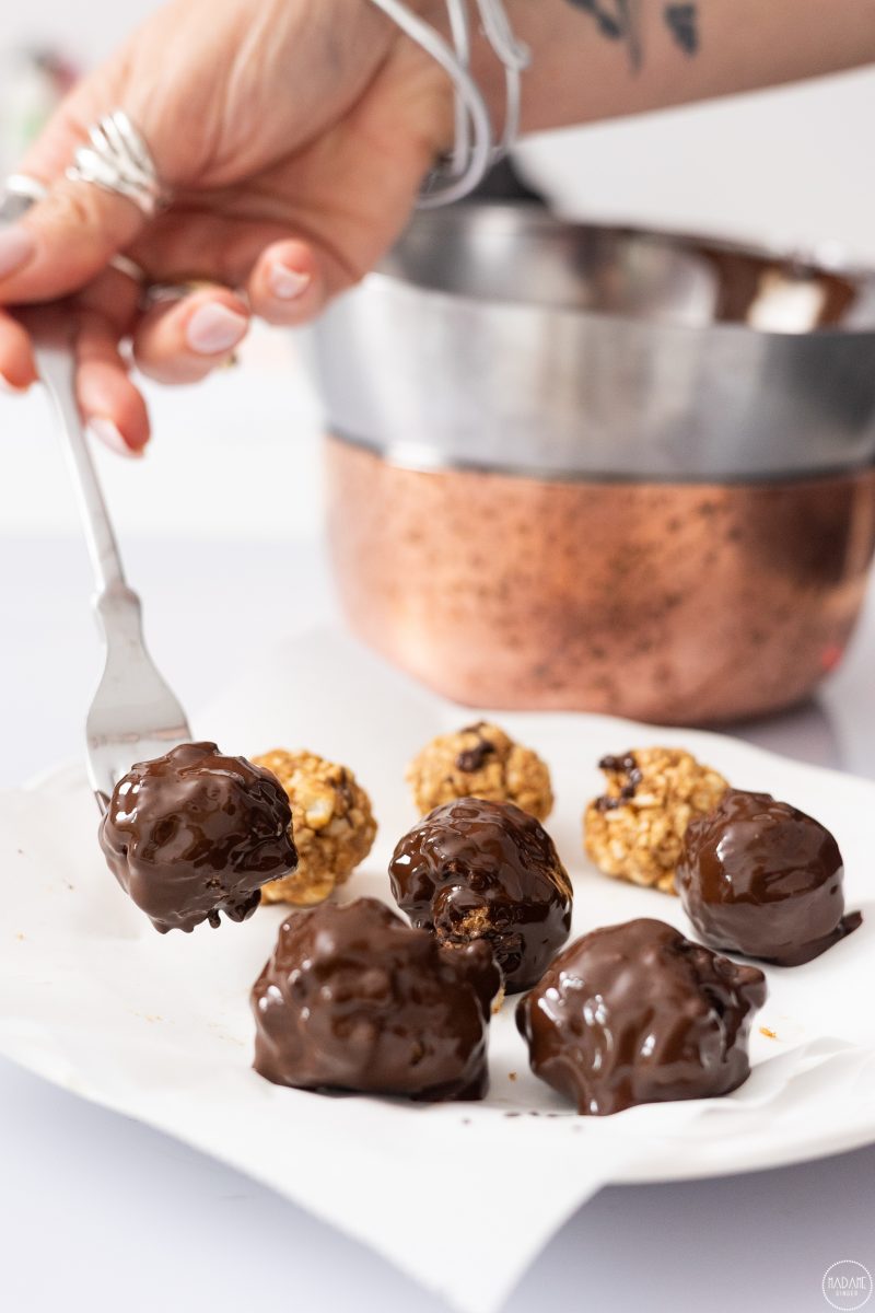 3)Περνάμε κάθε μπαλάκι από την κουβερτούρα μέχρι να καλυφθούν ομοιόμορφα και ακουμπάμε σε πιάτο με λαδόκολλα. Πασπαλίζουμε με τους ξηρούς καρπούς και βάζουμε στο ψυγείου για 20 λεπτά.