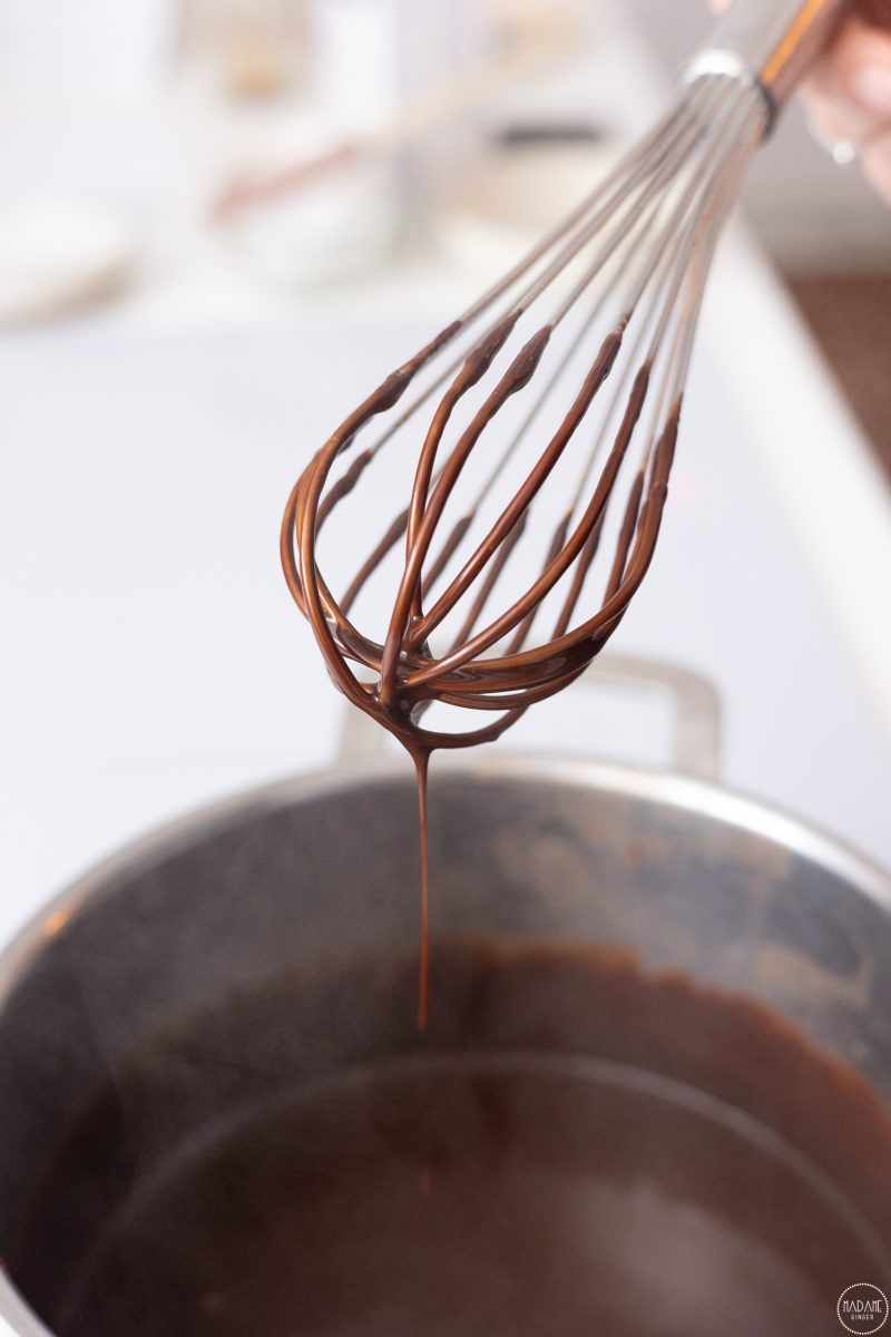 2)Μόλις αρχίσει να κοχλαζει, συνεχίζουμε το μαγείρεμα για 1 λεπτό ακόμα και αποσύρουμε απο την φωτιά. Ρίχνουμε το λάδι καρύδας και την κουβερτούρα,ανακατεύουμε, καλύπτουμε με μεμβράνη (να εφάπτεται) και αφήνουμε στην άκρη να κρυώσει 20 λεπτά.