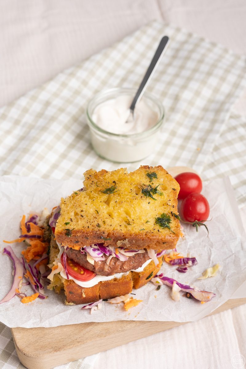 4) Συνθέτουμε το burger. Παίρνουμε 2 φέτες με ψωμί, απλώνουμε σε κάθε φέτα ψωμί από 1 κ.σ. μαγιονέζα, τη ντομάτα, 1 Garden Gourmet Sensational Burger, coleslaw, πίκλα, 1 κ.σ. μαγιονέζα, κλείνουμε με την άλλη φέτα ψωμί και σερβίρουμε.