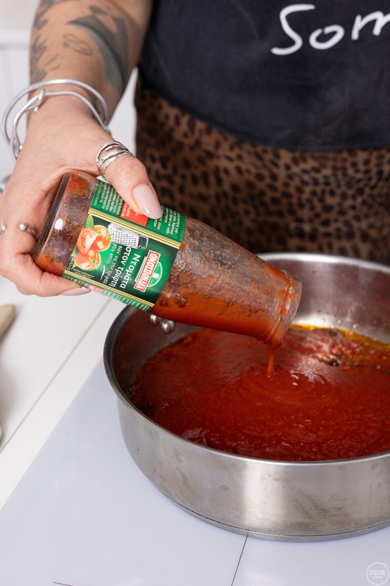 4)Όσο γίνονται τα σουτζουκάκια ετοιμάζουμε τη σάλτσα. Σε βαθύ τηγάνι, ρίχνουμε 4-5 κ.σ. ελαιόλαδο και αφήνουμε να ζεσταθεί. Μόλις ζεσταθεί ρίχνουμε το σκόρδο, τον πελτέ και τα μπαχαρικά και σοτάρουμε για 1 λεπτό. Περιχύνουμε με την ντομάτα στον τρίφτη ΟΜΟΣΠΟΝΔΙΑ, μαγειρεύουμε για 2-3 λεπτά, προσθέτουμε το νερό, αλατοπιπερώνουμε, χαμηλώνουμε ελαφρώς το μάτι και αφήνουμε να βράσει η σάλτσα για 10 λεπτά. Μόλις είναι έτοιμη κι έχει δέσει, κλείνουμε τη φωτιά, αφαιρούμε τα μπαχάρια και περιχύνουμε με 1 κ.σ. ελαιόλαδο.