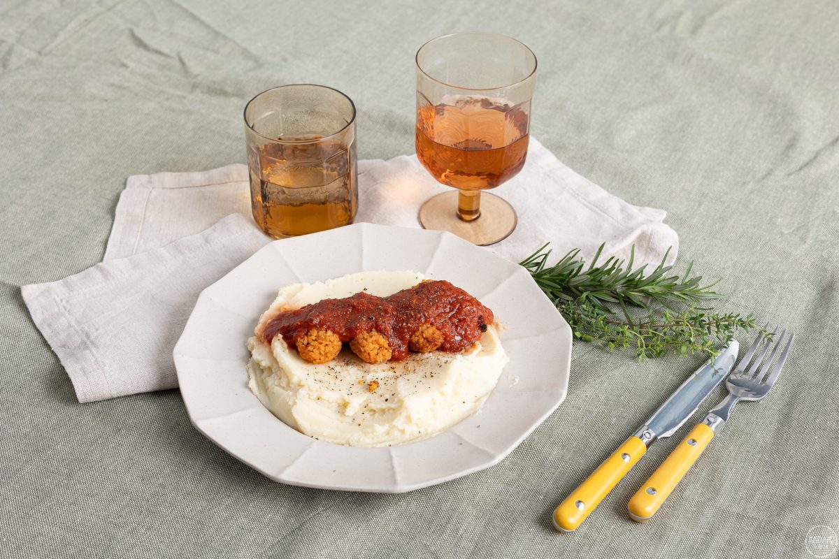5)Μόλις είναι έτοιμα τα σουτζουκάκια τα σερβίρουμε με πουρέ πατάτας και τη σάλτσα ντομάτας.