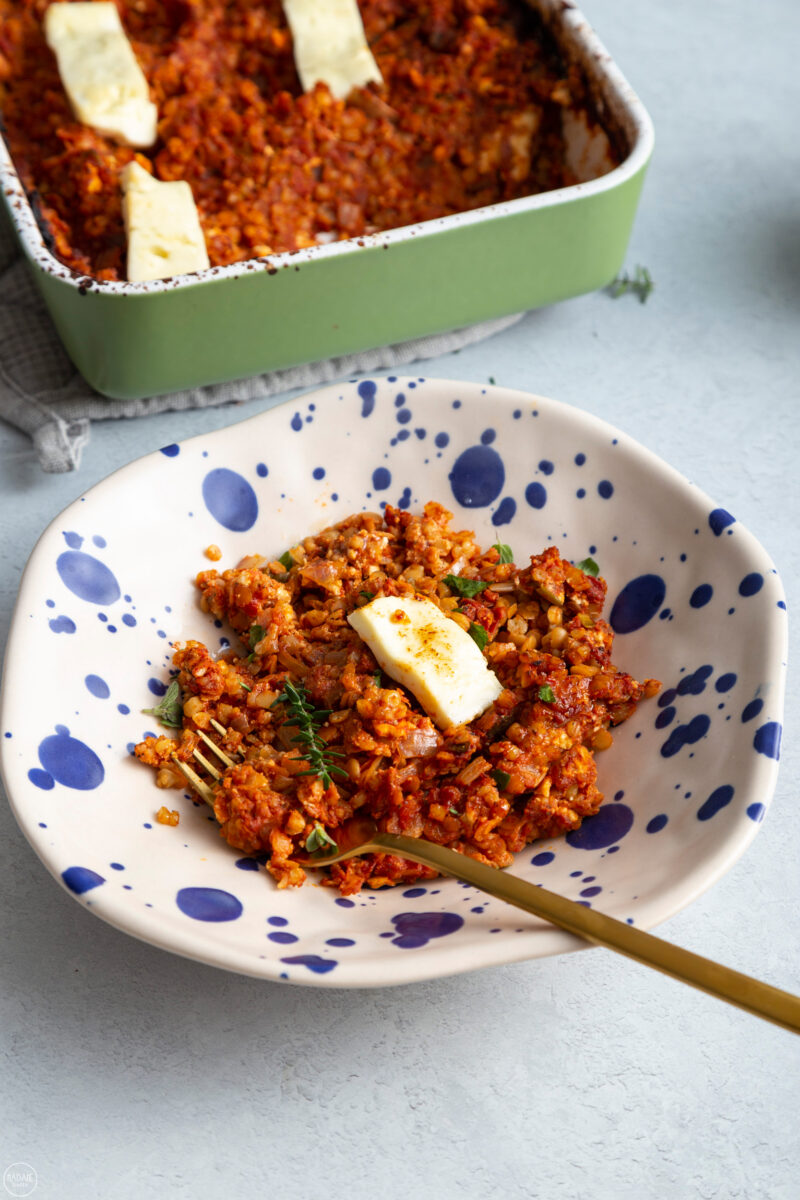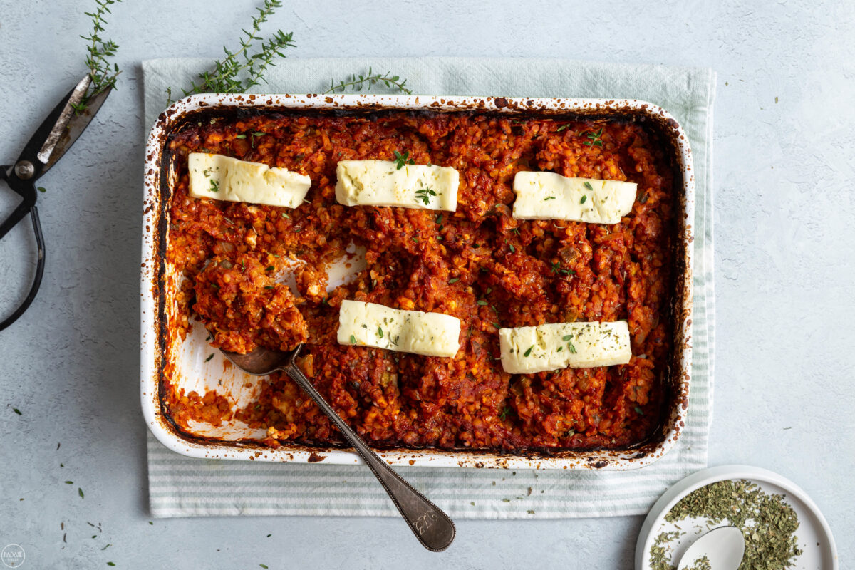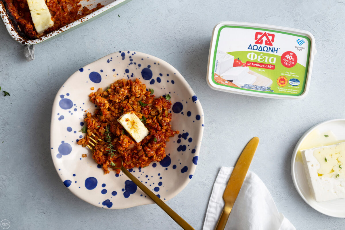 Κοκκινιστές φακές στο φούρνο με πλιγούρι & φέτα