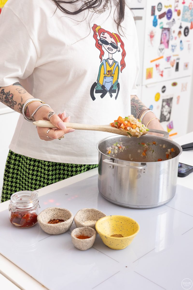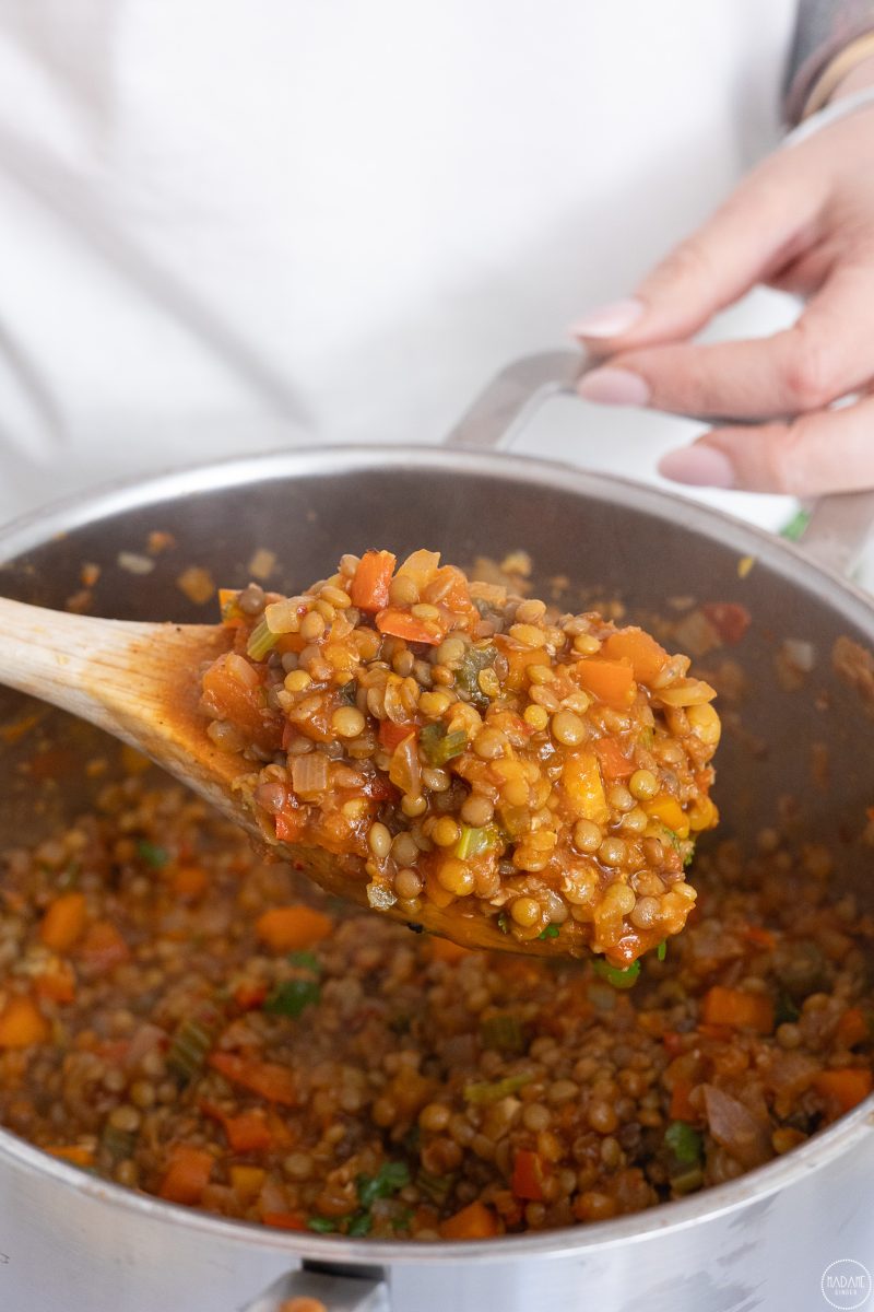 4) Προσθέτουμε την ντομάτα, τις Φακές OLA BIO, τον ζωμό λαχανικών και βράζουμε για άλλα 6-8 λεπτά μέχρι να δέσει.