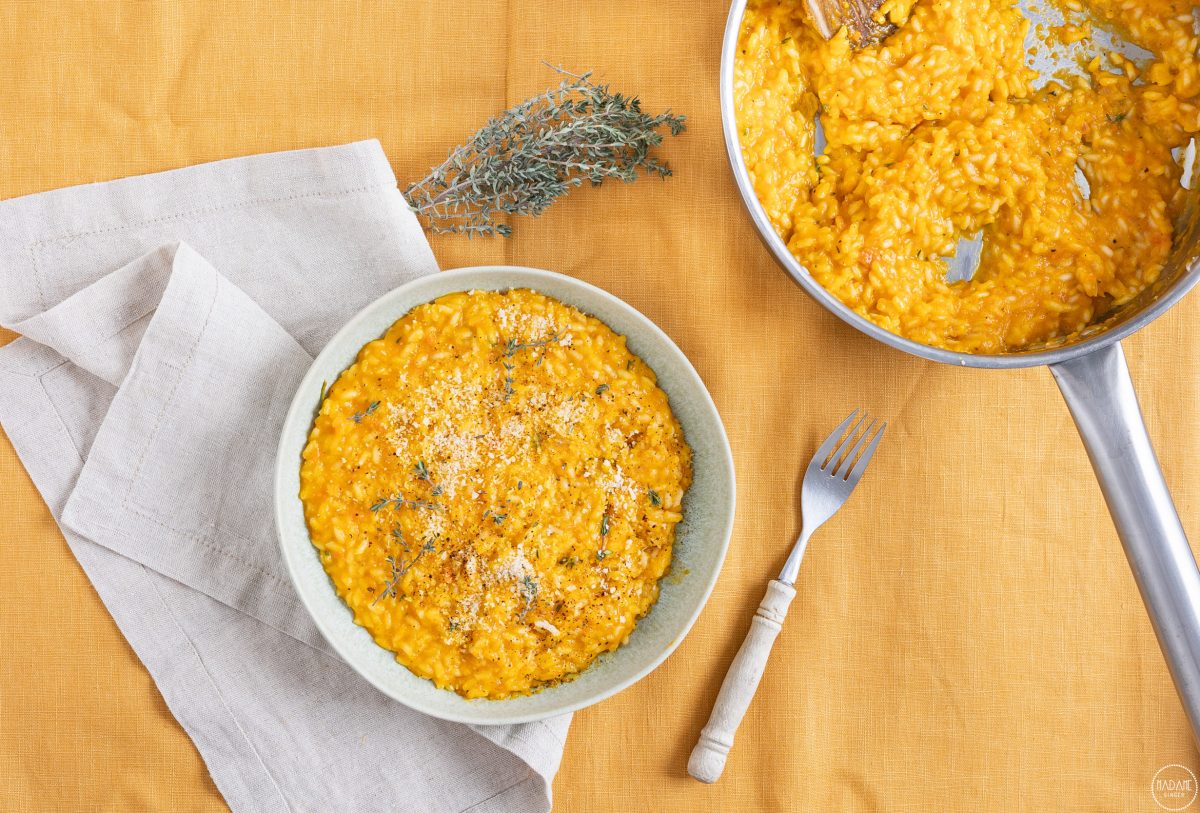 6)Στην τελευταία δόση ζωμού-νερού ρίχνουμε και τον πουρέ καρότου, αλατοπιπερώνουμε ελαφρώς, προσθέτουμε 2-3 κλωναράκια θυμάρι και ανακατεύουμε μέχρι να δέσει.
