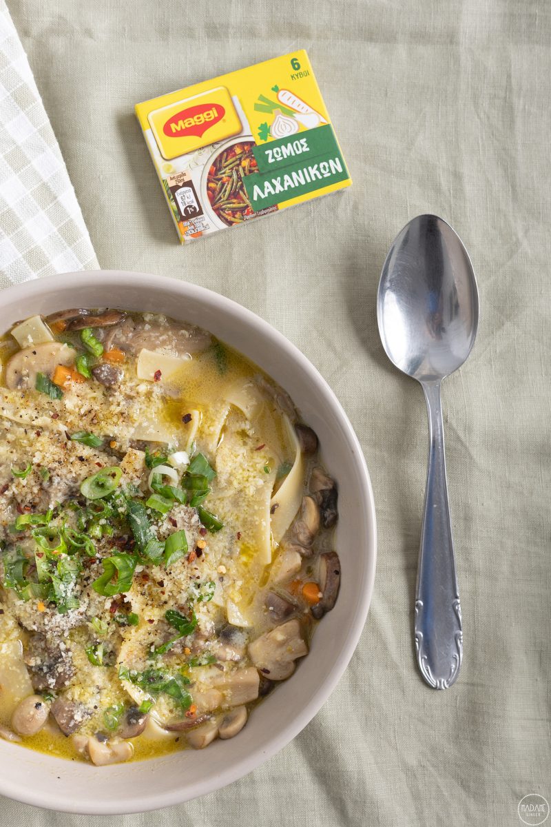 Αν υπάρχει μια σούπα που σε κάνει να ανυπομονείς για τις πρώτες κρύες μέρες, είναι αυτή. Πλούσια, γεμάτη άρωμα και γεύση, η μανιταρόσουπα με χυλοπίτες είναι από αυτές που τρως και νιώθεις αμέσως cozy. Ο ζωμός λαχανικών Maggi την απογειώνει, δίνει φουλ γεύση και κάνει κάθε κουταλιά ακόμα πιοαπολαυστική.