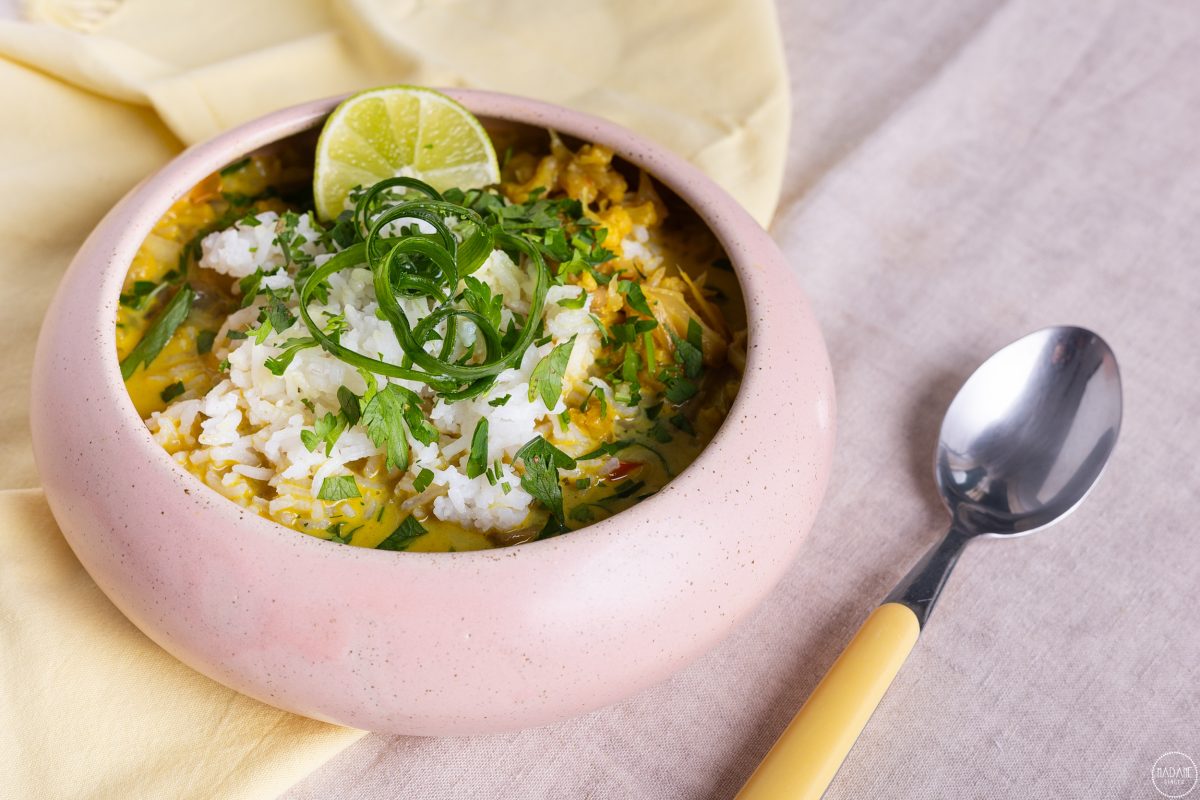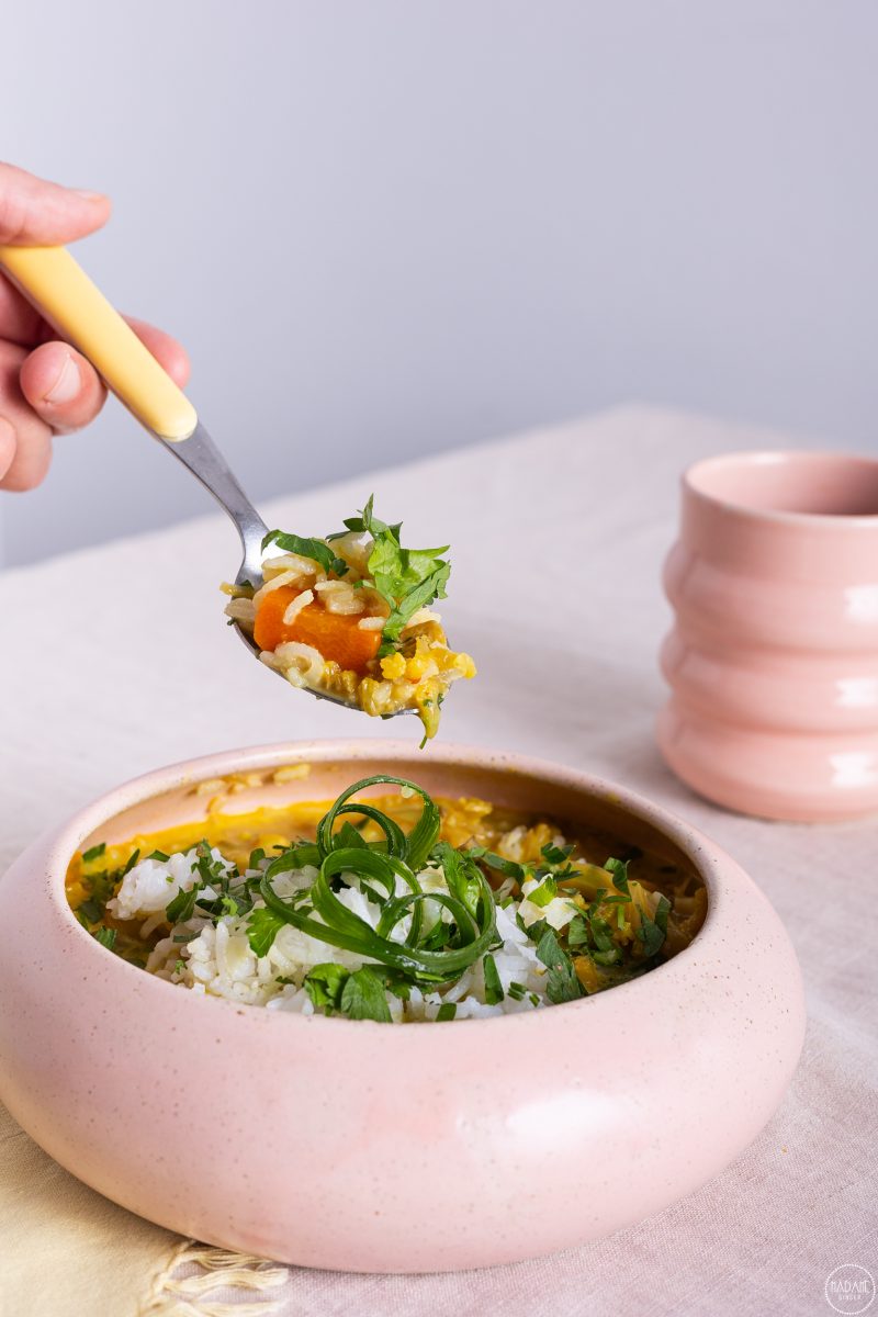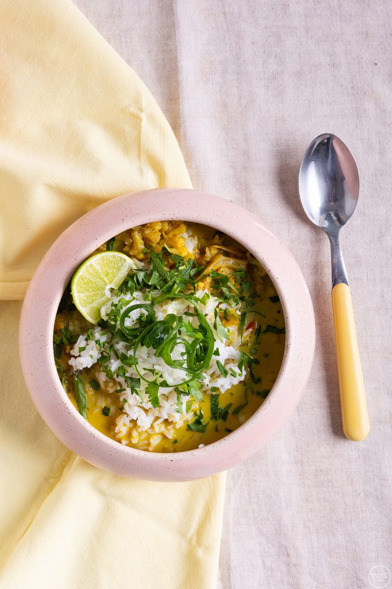 Σούπα με λαχανικά και γάλα καρύδας.