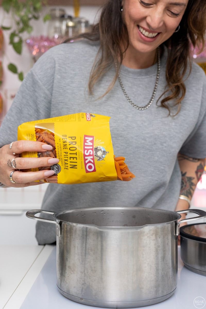1)Ετοιμάζουμε τα ζυμαρικά. Γεμίζουμε μια κατσαρόλα με νερό και τη βάζουμε σε ψηλή φωτιά με κλειστό καπάκι. Όταν βράσει το νερό στην κατσαρόλα, το αλατίζουμε καλά (35 γρ. αλάτι για 5 λίτρα νερό) και ρίχνουμε μέσα τα ζυμαρικά MISKO Protein Πέννε Ριγκάτε . Ανακατεύουμε και αφήνουμε να βράσουν 2 λεπτά λιγότερο από τους χρόνους που αναγράφονται στη συσκευασία. Σουρώνουμε, κρατώντας στην άκρη 50-100 ml από το νερό τους