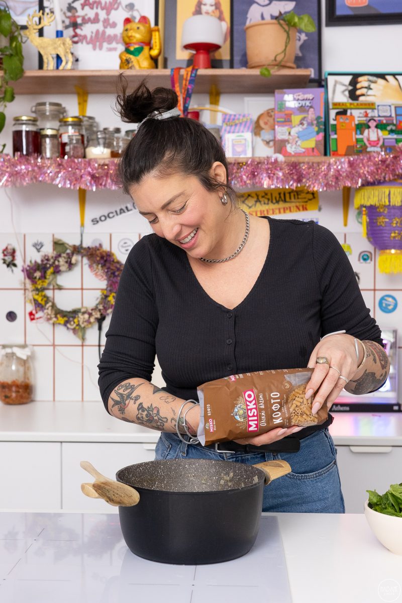 4)Ρίχνουμε τα MISKO Ολικής Άλεσης κοφτό και μαγειρεύουμε για τον χρόνο που αναγράφεται στη συσκευασία.