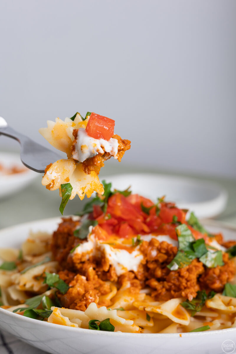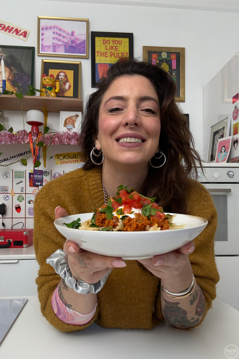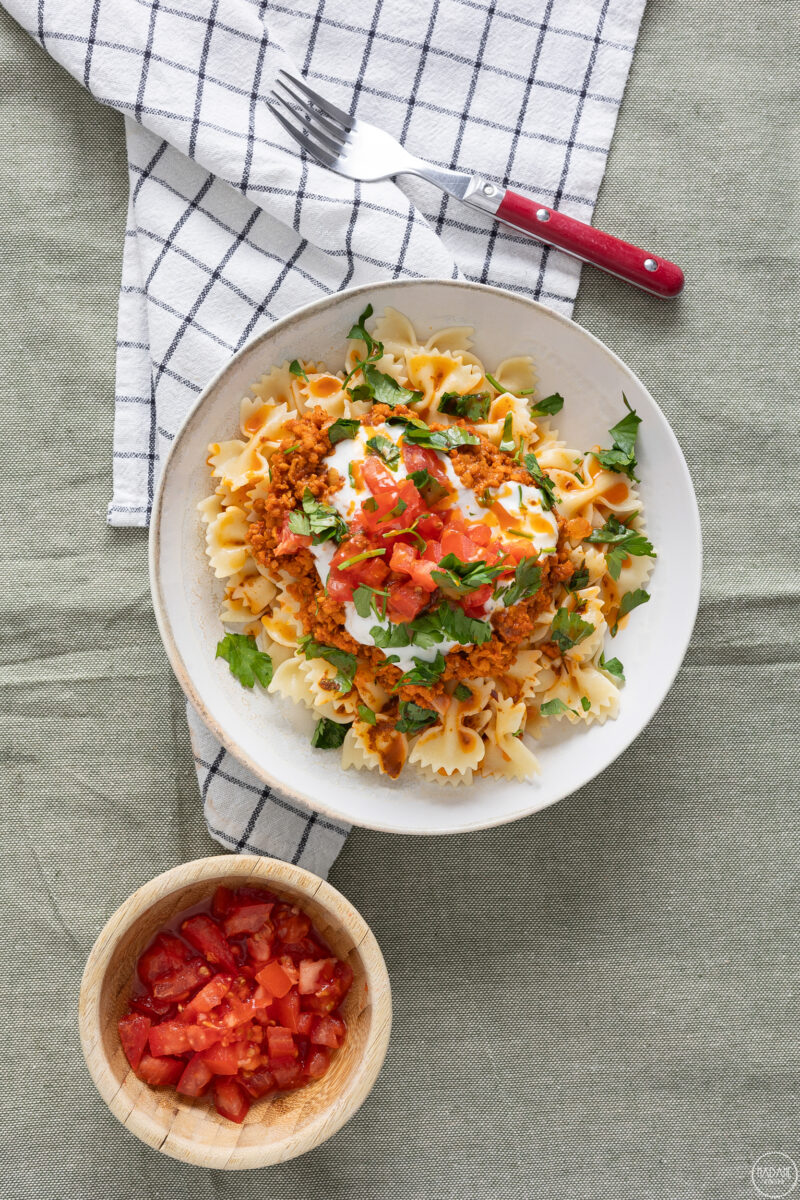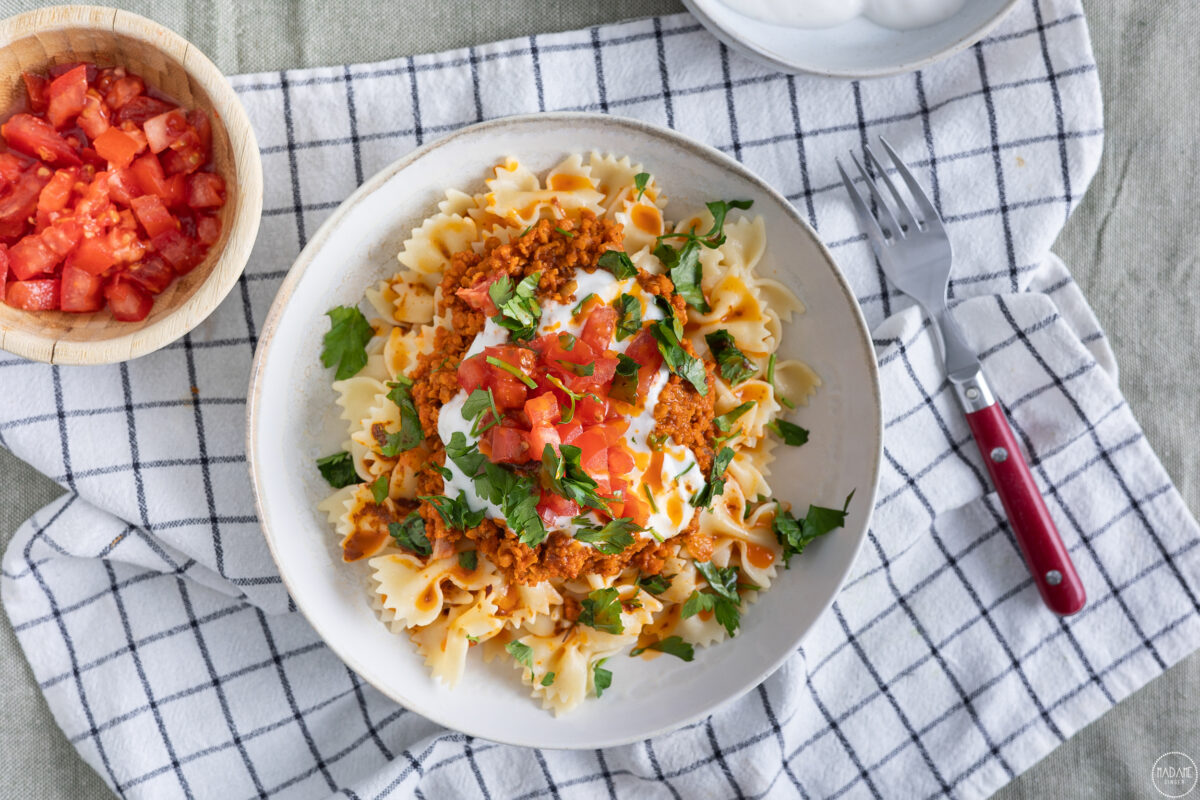 Μία μακαρονάδα με κιμά (σόγιας ο δικός μου) γιαούρτι αρωματισμένο με μπόλικο ωμό σκόρδο (μην κάνεις το λάθος και την φας την μέρα που το βράδυ έχεις να πας σε πάρτυ όπως εγώ) και ένα συγκλονιστικό βούτυρο αρωματισμένο με πάρπρικα και μπούκοβο που κάνει όλη την λαχταριστή διαφορά. Την δοκίμασα εγώ για σένα, εγκρίνω οπότε το μόνο που έχεις να κάνεις είναι να μπεις στο efood.gr να παραγγείλεις τα υλικά από το αγαπημένο σου σούπερ μάρκετ και να την φτιάξεις.