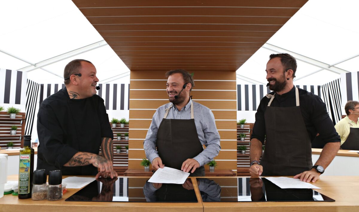 Δεν σταμάτησαμε να γελάμε με αυτούς τους τρεις τύπους. Ο Φερεντίνος να σαμποτάρει τις μαγειρικές του Δημήτρη, ο Γιώργος να προσπαθεί να ακολουθήσει τις συνταγές κατά γράμμα (και να τα καταφέρνει καθώς όπως αποδείχτηκε, ξέρει να μαγειρεύει πάρα πολύ καλά) και ο Σκαρμούτσος να κάνει αυτό που ξέρει καλύτερα: να μαγειρεύει “Γεύσεις του Τόπου μας” με τα προϊόντα των παραγωγών, να μοιράζεται τα μυστικά του, αλλά και να ακούει τις συμβουλές των έμπειρων νοικοκυρών που ήρθαν να μας δουν από κοντά.